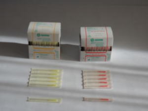 はりは、写真のように、一本づつ滅菌消毒されて、パック詰めされてた物を、ディスポーザブル(使い捨て)で使用しています。